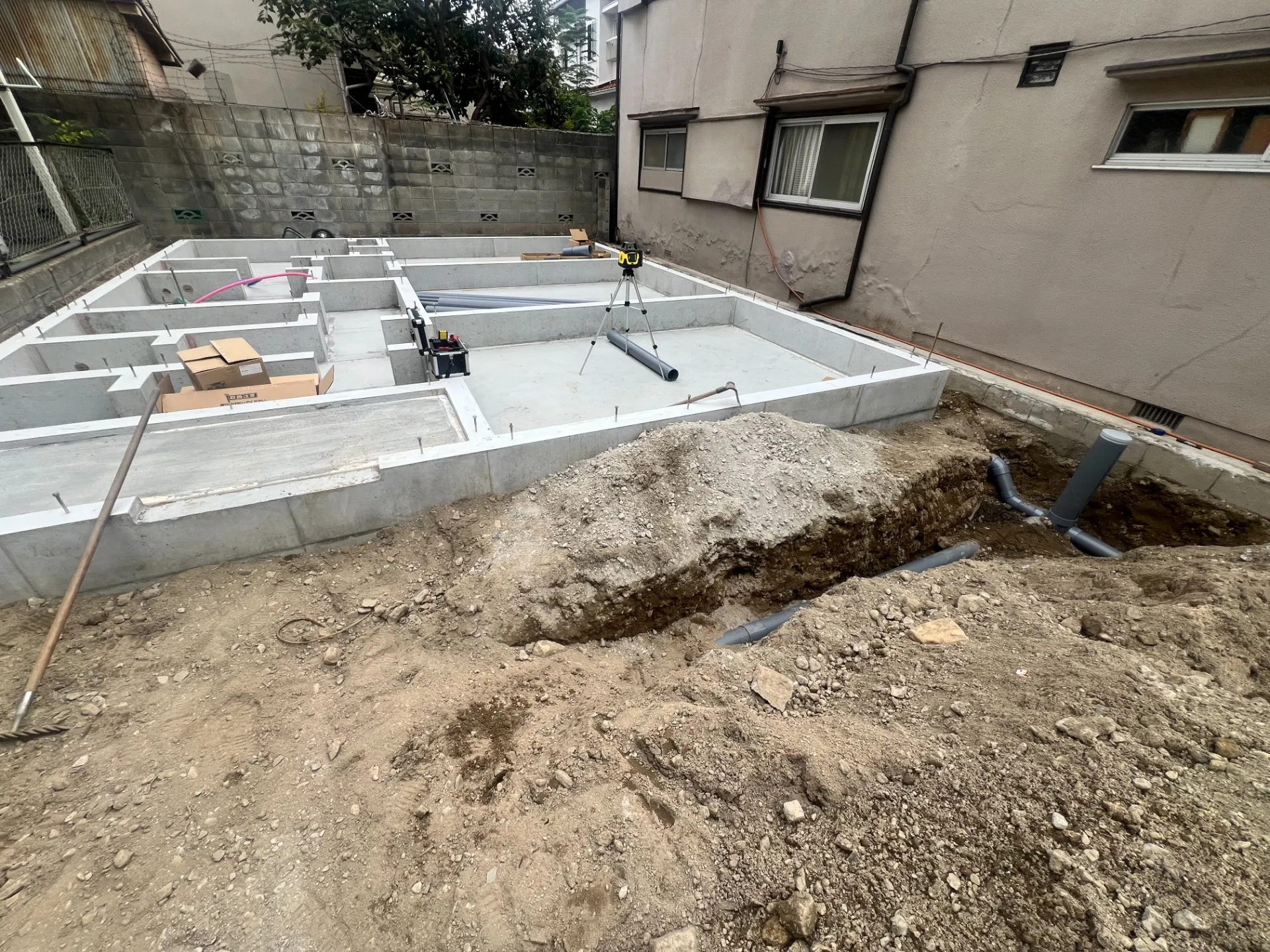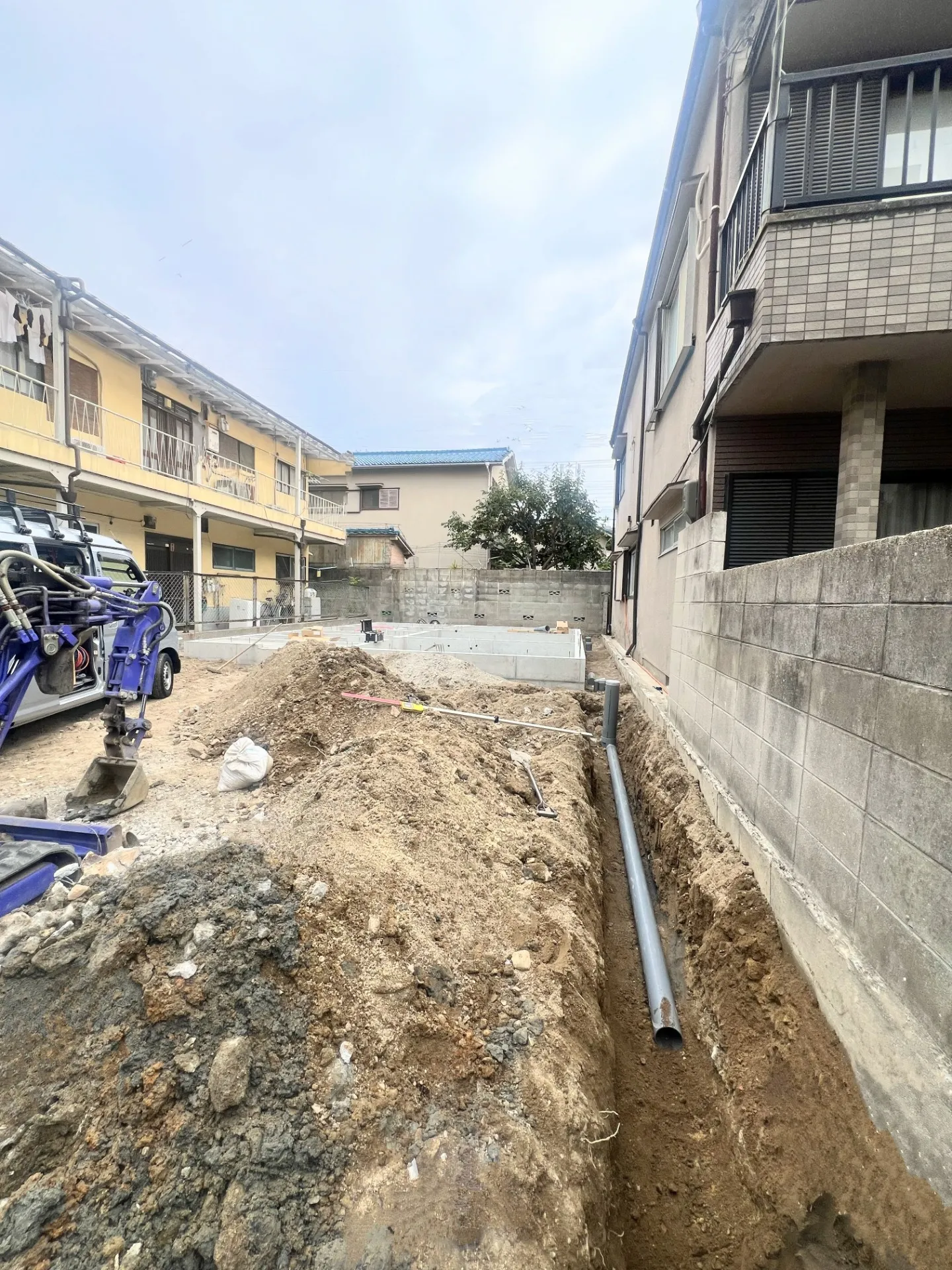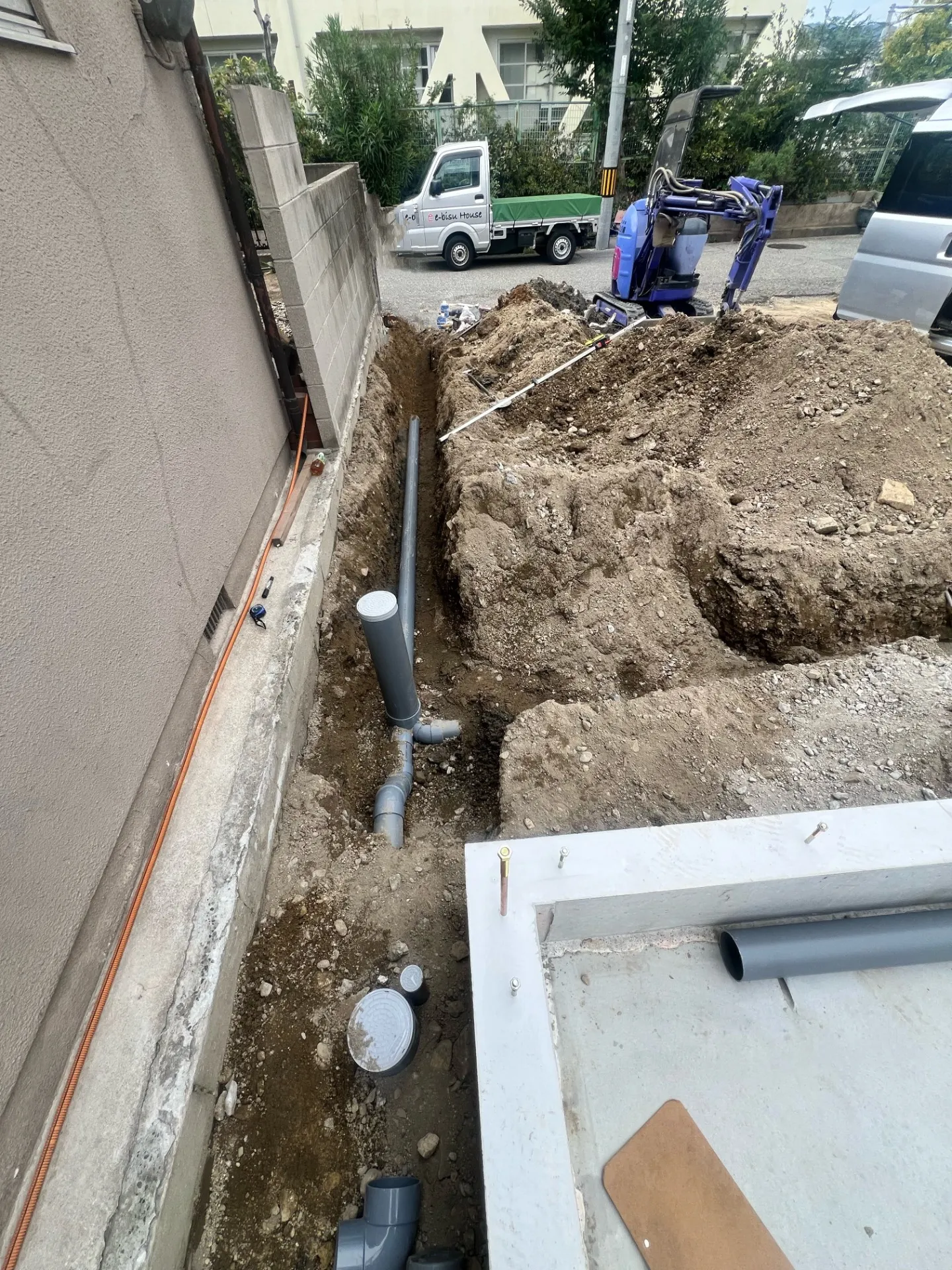 本日の作業は基礎が終わった後に下水配管を組む作業をしています。