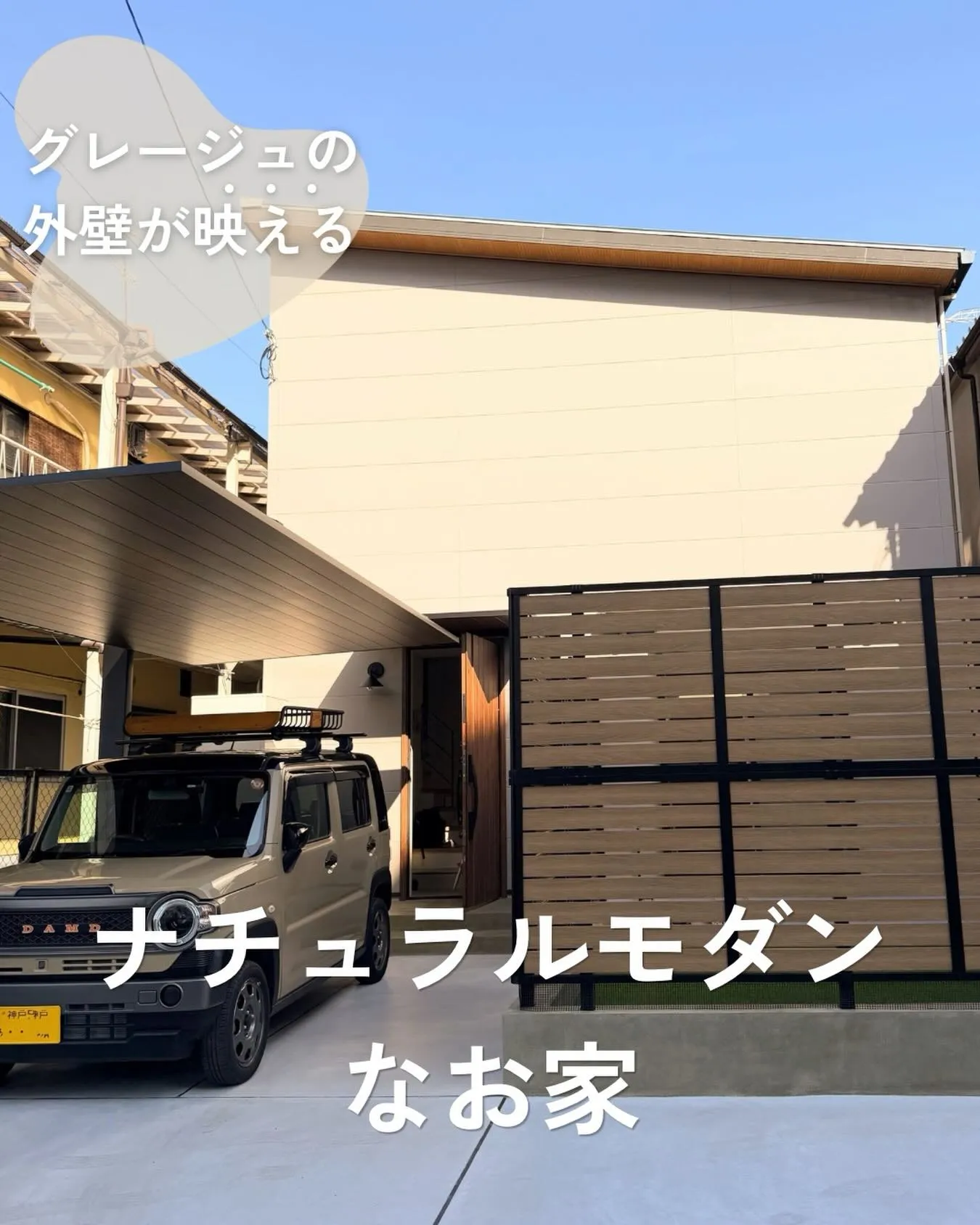 今流行りのグレージュの外壁に木目の軒•玄関・カーポート・塀などを木目で揃えて素敵なお家になりました☺︎