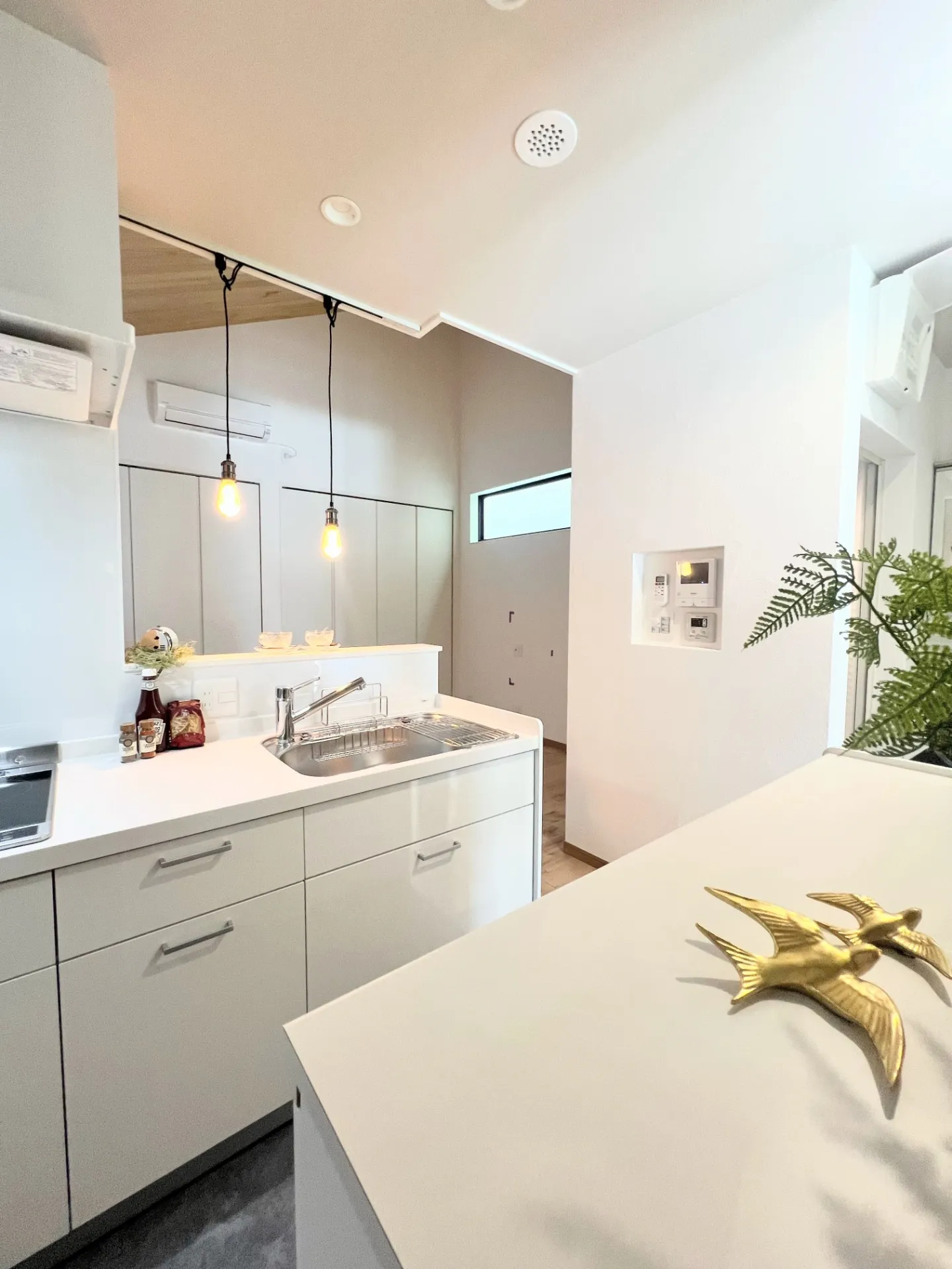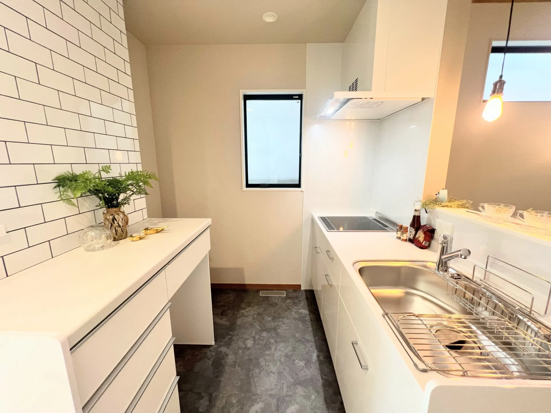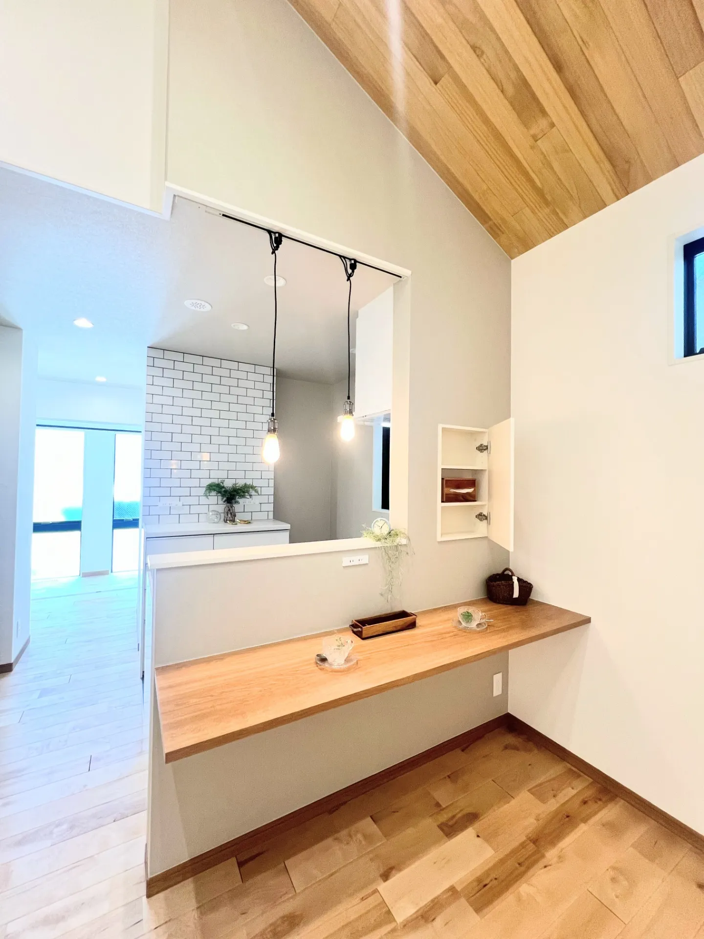 キッチン背面はカウンター。ここで食事は完結します。キッチンアクセントにシンプルなタイルを貼っています。おしゃれなペンダントライトでお家空間を素敵に。ちょっとした工夫で特別なお家の時間になりますね。
