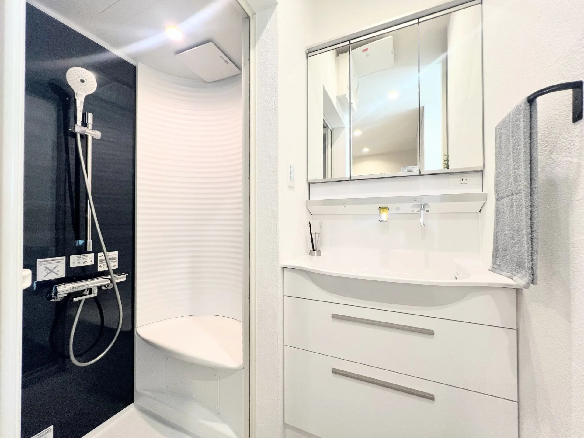 洗面左は贅沢なシャワールーム。今回初めて設置したゆったり座れるシャワールーム、TOTOです。お施主様もお気に入りのシャワールームです。