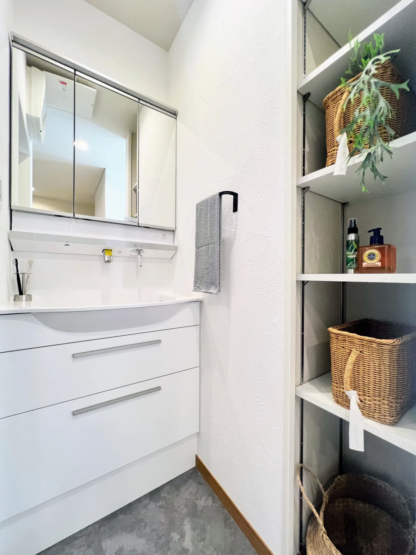 洗面はすぐ横のデッドスペースを活用して便利な収納棚にしました。社長一押しのアイデアです。可動式なのでお好きな高さに設定して必要なものを。ストックのタオルやペーパー、シャンプー類なども置けて便利です。