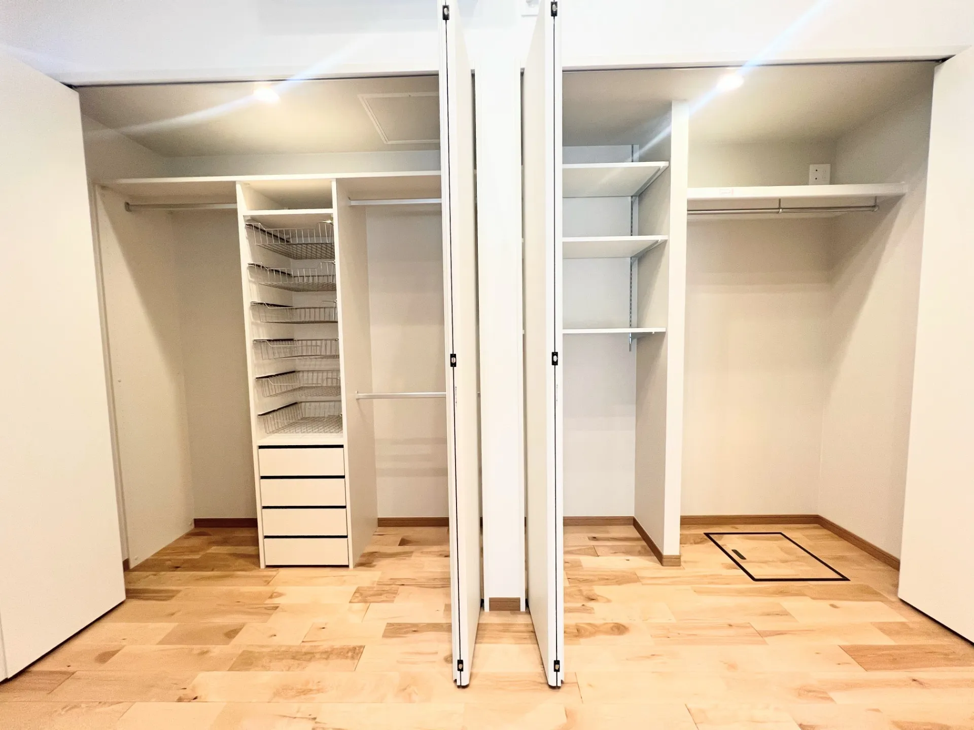 リビングの奥にはこんなにたっぷり収納があります。奥行もしっかりあり、布団から洋服までここにすべて収納が可能です。