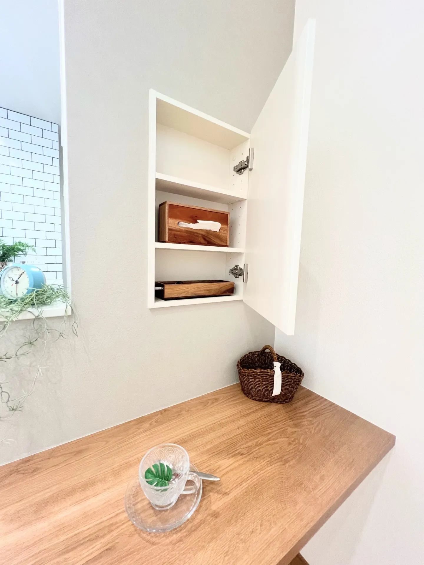 カウンター上の壁はもったいないから収納に。ティッシュペーパーやお箸などもここにピッタリ収まります。ちょっとした文具も収まります。とても便利な収納です。