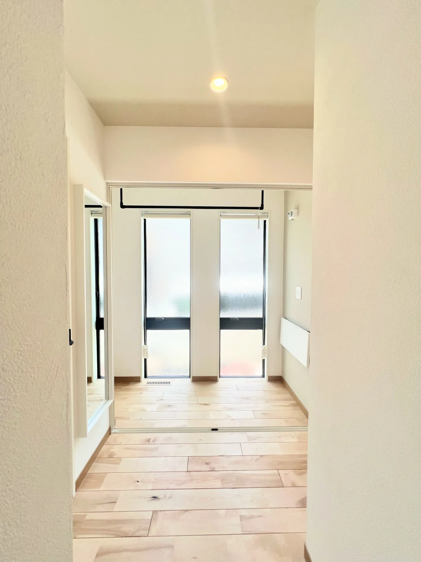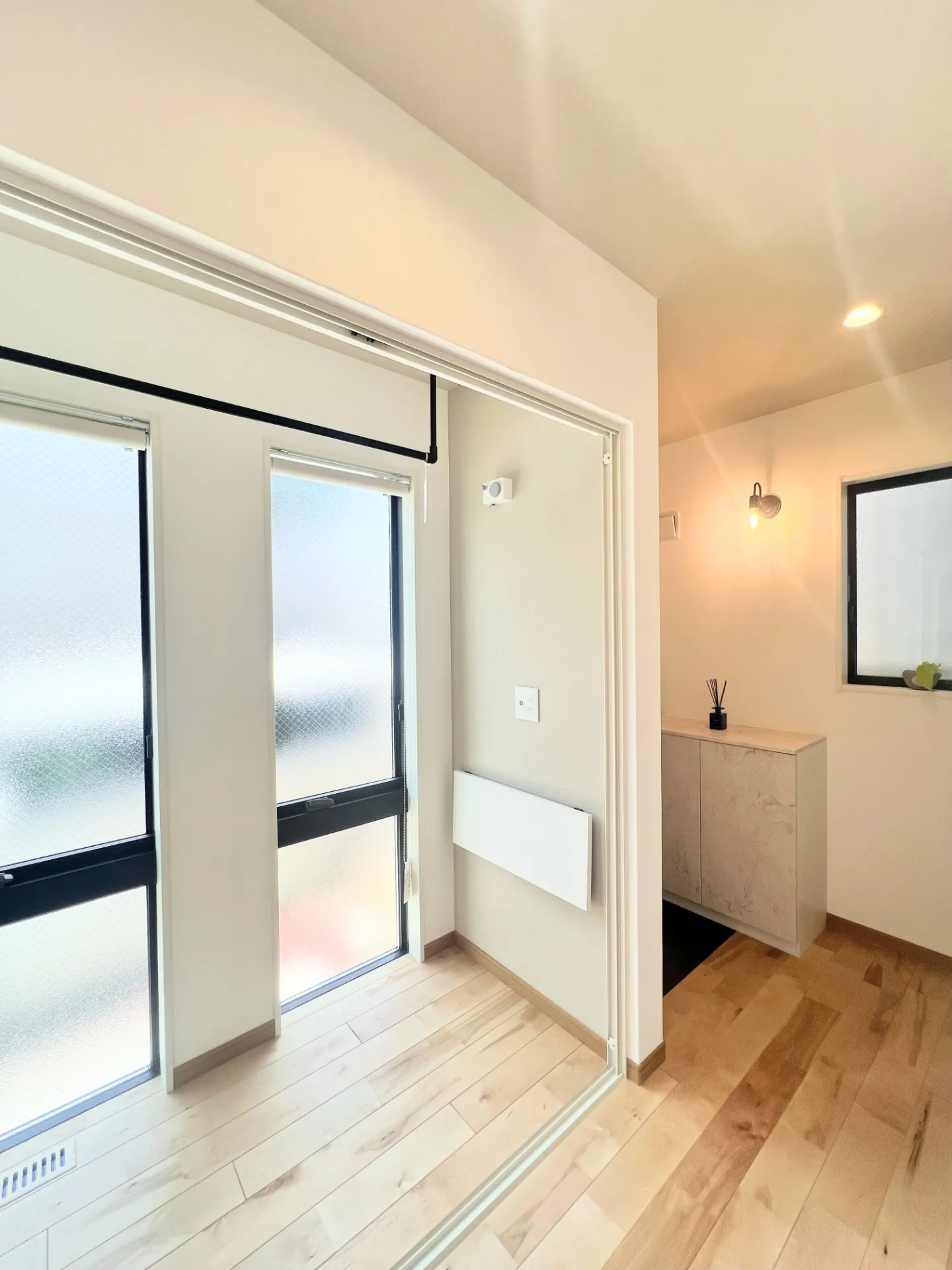サンルームには上げ下げできるデスクやテレビジャックも完備!実はこのお部屋は内側にもう一つサッシ窓が仕込まれています。お洗濯を干した際、サッシを閉めロールカーテンをすると生活感をシャットできます。アウト