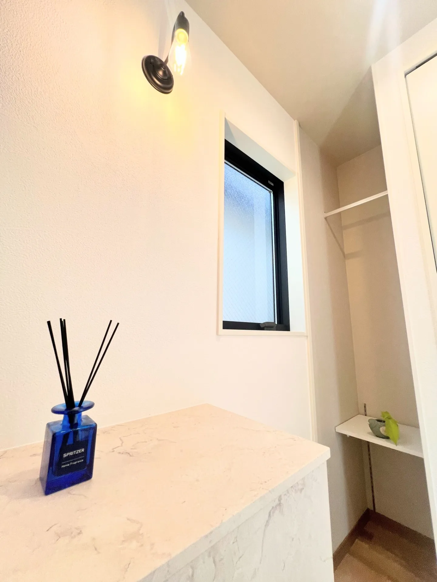 玄関はエイダイの下駄箱をセレクトしました。大理石調の柄がとても高級感があって素敵です。少しの空間も無駄にせず、その奥にはコート掛けスペースも!